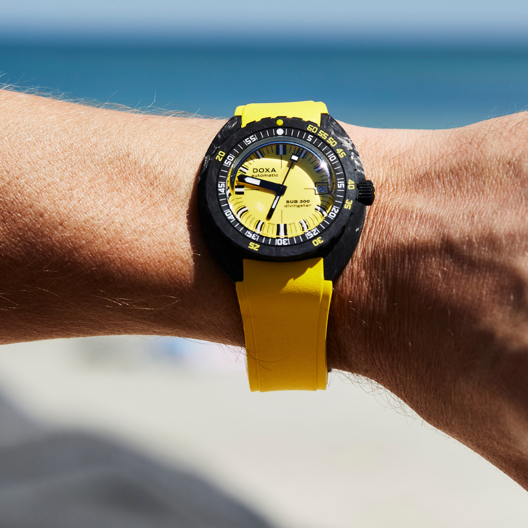 Die SUB 300 aus Carbon ist in 8 Farbvarianten erhältlich und mit einem entweder farblich auf das Zifferblatt abgestimmten oder schwarzen Kautschukarmband ausgerüstet, das beidseitig das unverkennbare DOXA-Logo trägt. Das Band wird durch eine PVD-beschichtete Faltschliesse mit dem exklusiven DOXA-Logo in Form eines Fisches verschlossen. Jedes Band ist mit einer verstellbaren Schnellverlängerung zum Tragen über dem Taucheranzug versehen.