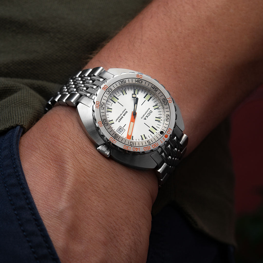 Diese 3-Zeiger-Taucheruhr ist in 8 Zifferblattfarben erhältlich und verbindet die ästhetischen Werte der SUB 300T Conquistador mit den technischen Raffinessen, die eine Hochleistungs-Taucheruhr von heute auszeichnen. Die SUB 300T ist aus hochwertigem 316L-Edelstahl gefertigt, hat einen Durchmesser von 42,5 mm und ein kratzfestes Saphirglas mit Antireflexbeschichtung. Diese Taucheruhr hält bis zu 120 bar aus und ist bis zu einer Tiefe von 1.200 Metern effektiv wasserdicht. Sie verfügt über die patentierte, unidirektionale Lünette mit integriertem Nullzeitrechner. Alle Elemente, die tauchrelevante Informationen liefern, sind mit Super-LumiNova®-Einlagen versehen, um eine optimale Lesbarkeit unter Wasser zu gewährleisten. Das Armband besteht aus Edelstahl 316L und verfügt über eine Faltschließe mit dem DOXA-Fischsymbol.