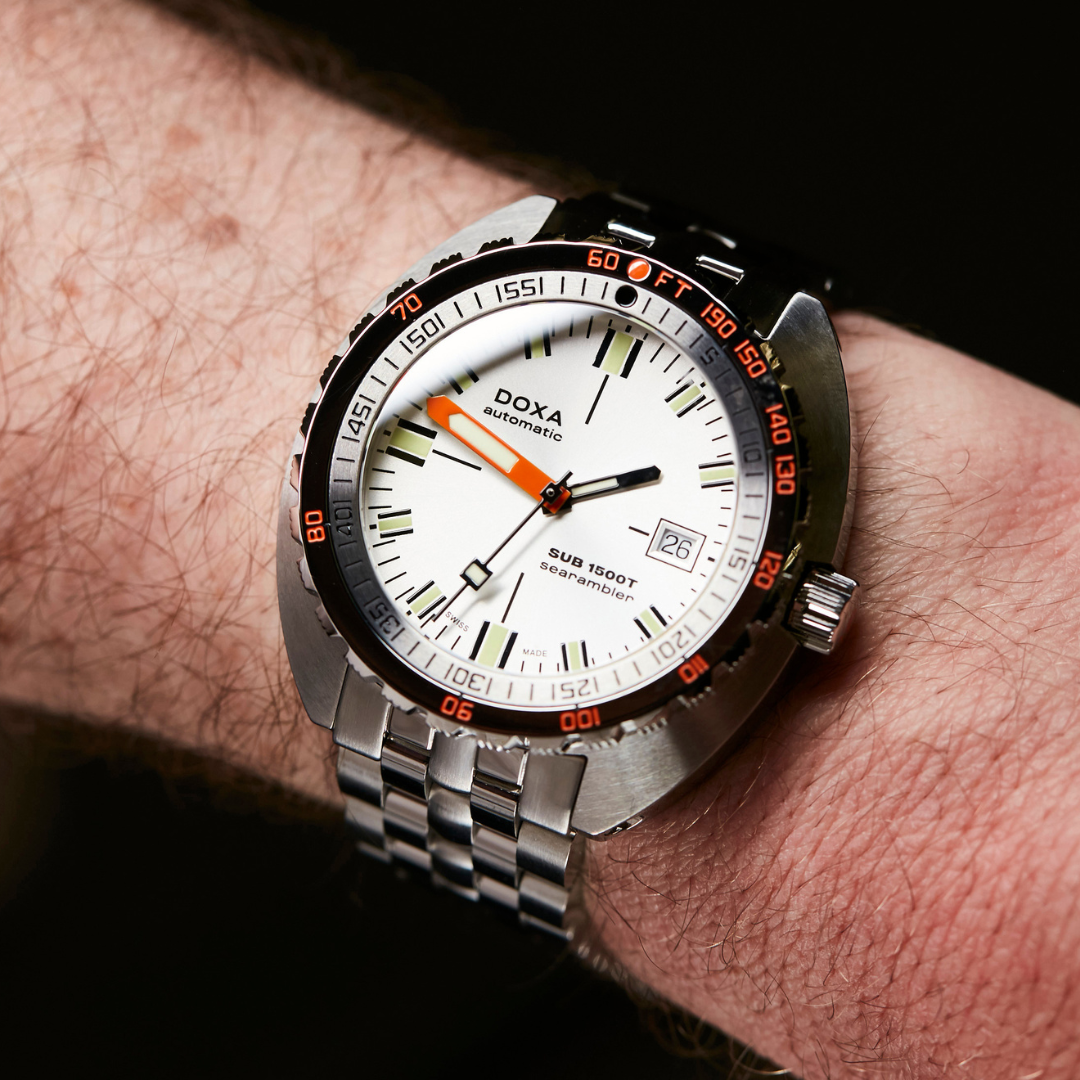 La sua cassa coussin è realizzata in acciaio 316L di altissima qualità. Il SUB 1500T, di 45.00 mm di diametro, è impermeabile a 160 ATM, per profondità di immersione fino a 1,500 metri. In omaggio al SUB 300T Conquistador, presenta la stessa lunette girevole unidirezionale brevettata e la valvola di fuoriuscita dell'elio del suo leggendario predecessore. Tutti gli elementi che forniscono informazioni critiche sono dotati di rivestimento luminescente Super luminova® per garantire una leggibilità ottimale sott'acqua. Il bracciale in acciaio 316L ha una chiusura deployante col simbolo del pesce DOXA.